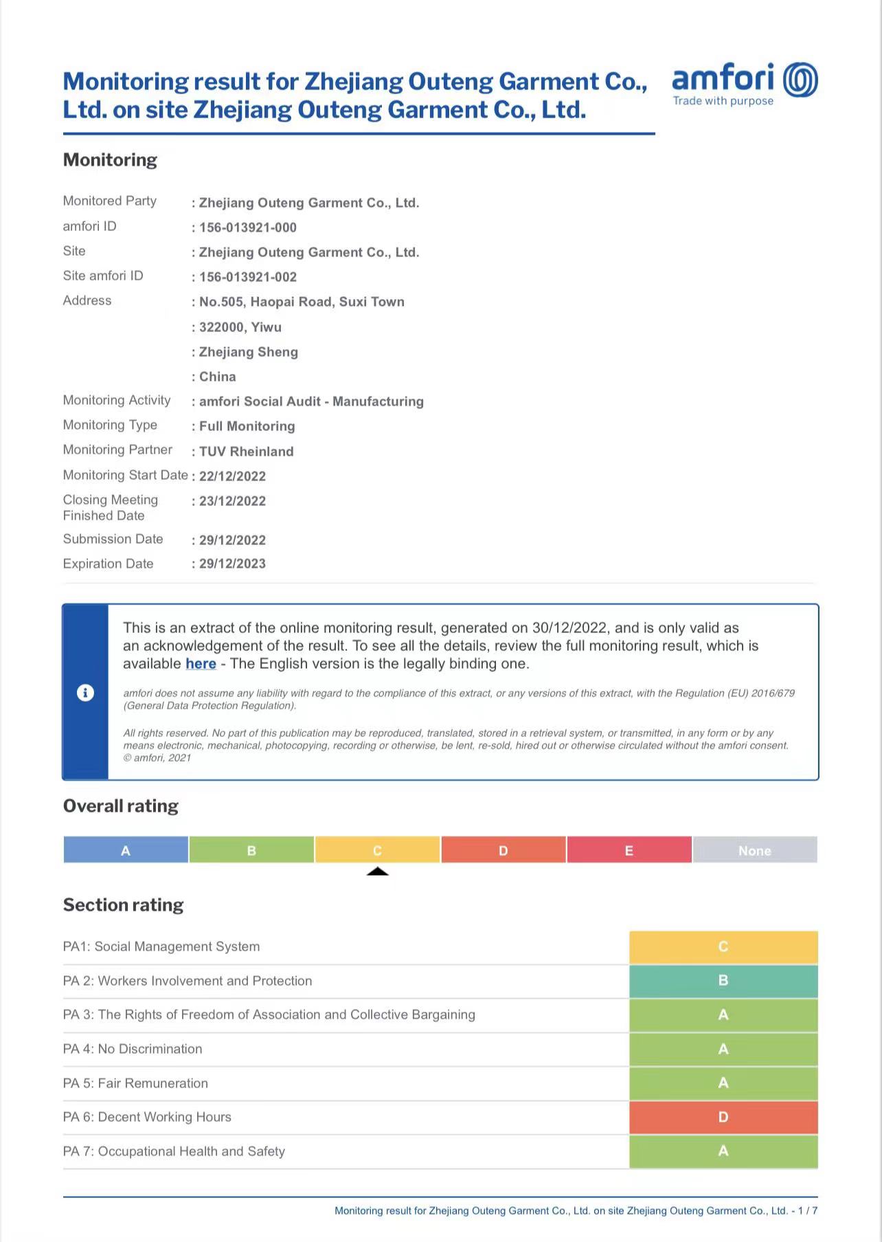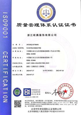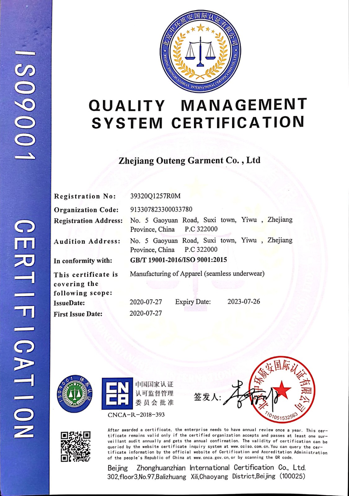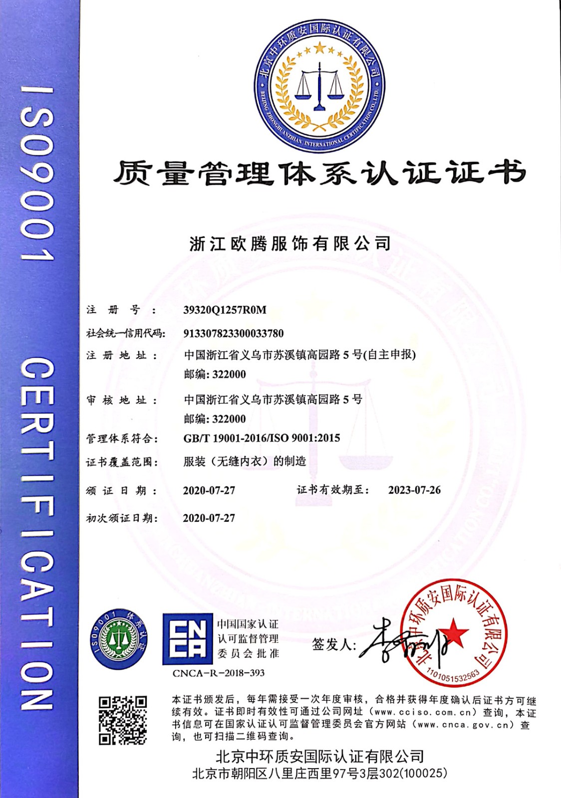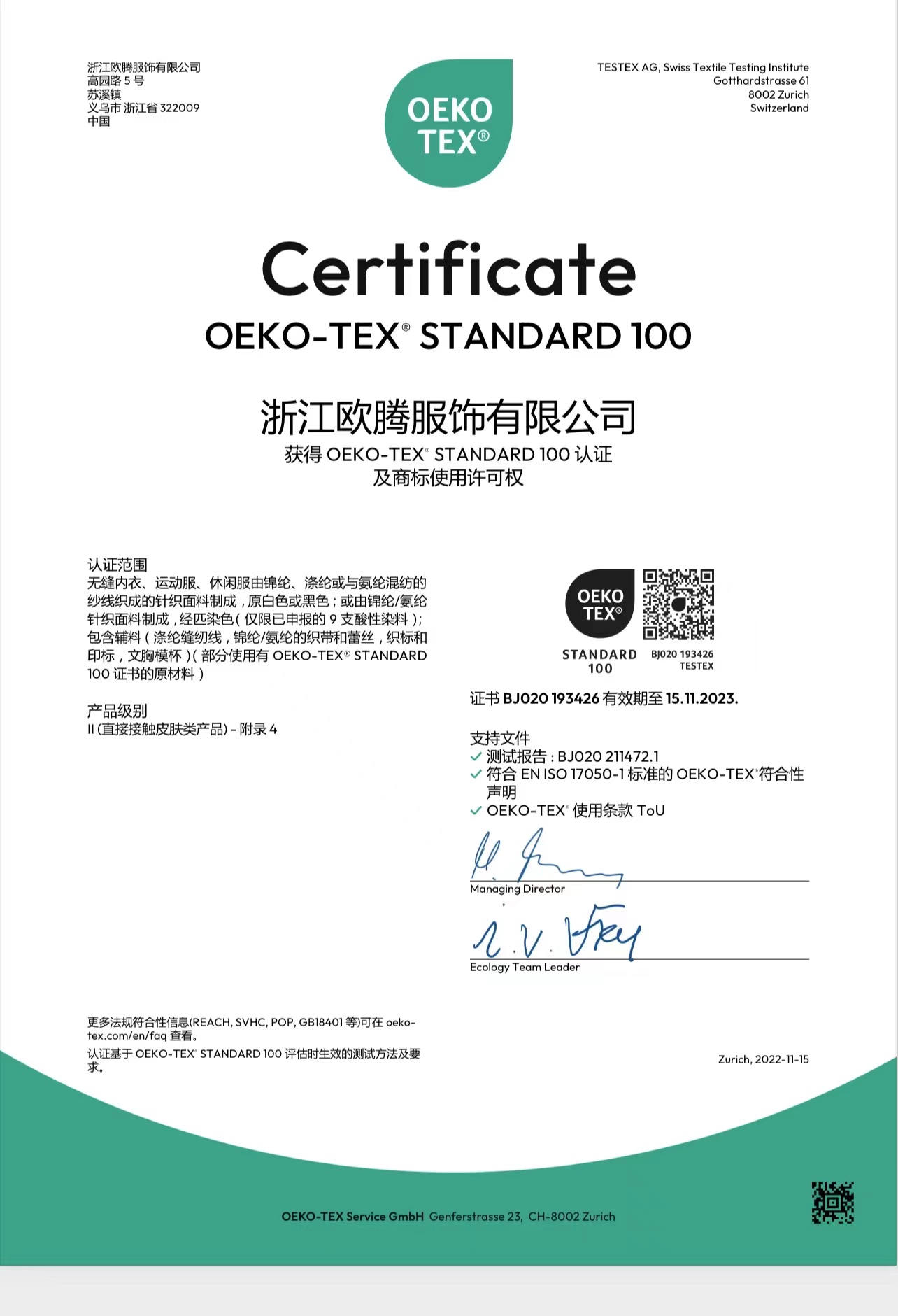 浙江歐騰服飾有限公司位于世界小商品之都-義烏。創(chuàng)立于2015年,是一家專業(yè)生產(chǎn)無縫針織運動服飾和內(nèi)衣的工貿(mào)一體企業(yè),擁有自主出口權(quán)。 工廠的占地面積約16000平方米 ,引進了大型圣東尼、高騰等多種先進的制衣設備300余臺。月產(chǎn)能可達90萬件。 歐騰服飾每年投入近百萬資金打樣開發(fā)新產(chǎn)品,有著一支高素質(zhì)設計、技術(shù)員工隊伍。工廠先后通過了ISO 9001質(zhì)量管理體系認證、BSCI認證、GRS認證、OEKO-TEX國際生態(tài)紡織品認證等多項專利檢測報告??商峁㎡EM&ODM服務。歐騰服飾以一套完整、科學的質(zhì)量管理體系,生產(chǎn)的服裝從原材料紗線到成衣,質(zhì)量完全能夠滿足國內(nèi)、國際質(zhì)量要求。獲得了客戶一致好評。工廠先后獲得省科技型企業(yè)、國家高新企業(yè)、義烏市誠信講信用單位、規(guī)上企業(yè)、信用AAA級等榮譽。